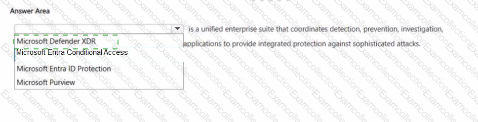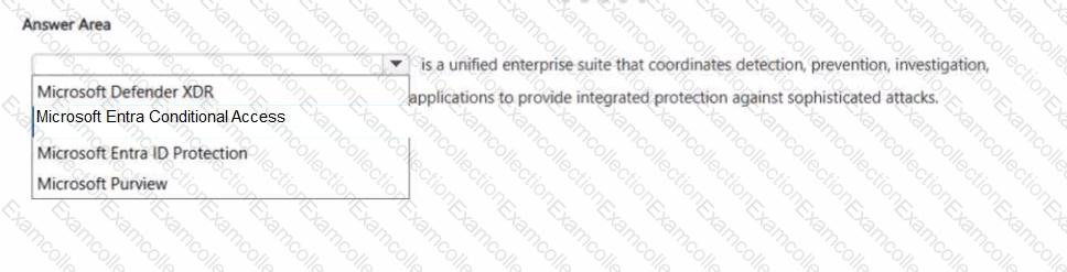 The other options do not fit that definition. Microsoft Entra Conditional Access is Microsoft’s Zero Trust policy engine used to evaluate signals and enforce access policies, not a cross-domain threat detection and response suite. Microsoft Entra ID Protection focuses on detecting and responding to identity risks such as risky sign-ins and risky users. Microsoft Purview is Microsoft’s portfolio for data governance, data security, and compliance. None of those products is described by Microsoft as coordinating detection, prevention, investigation, and response across endpoints, identities, email, and applications in the same integrated XDR manner. Therefore, the only answer that correctly completes the sentence is Microsoft Defender XDR .