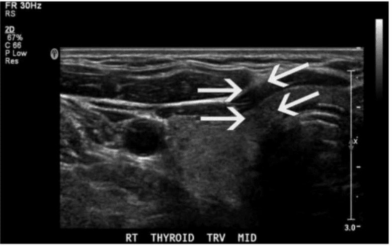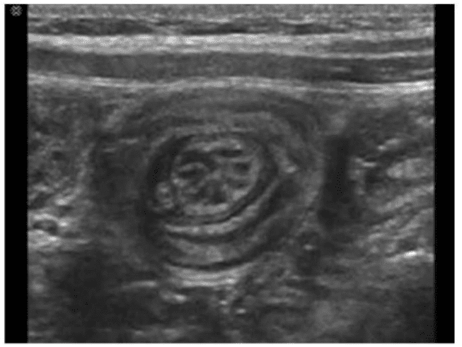 A patient presents with right lower quadrant pain and fever. Which condition is most likely indicated by the arrow on this image?