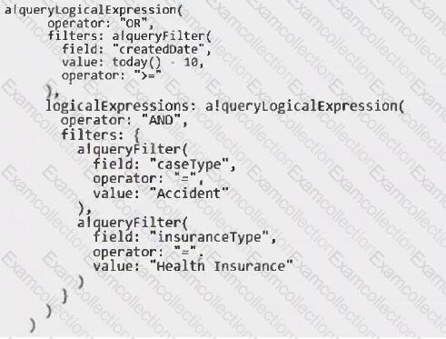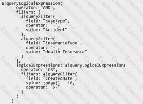 You need to update the query entity to display all the cases that are "Accident" case type and "Health Insurance" insurance type, or created in the last ten days.