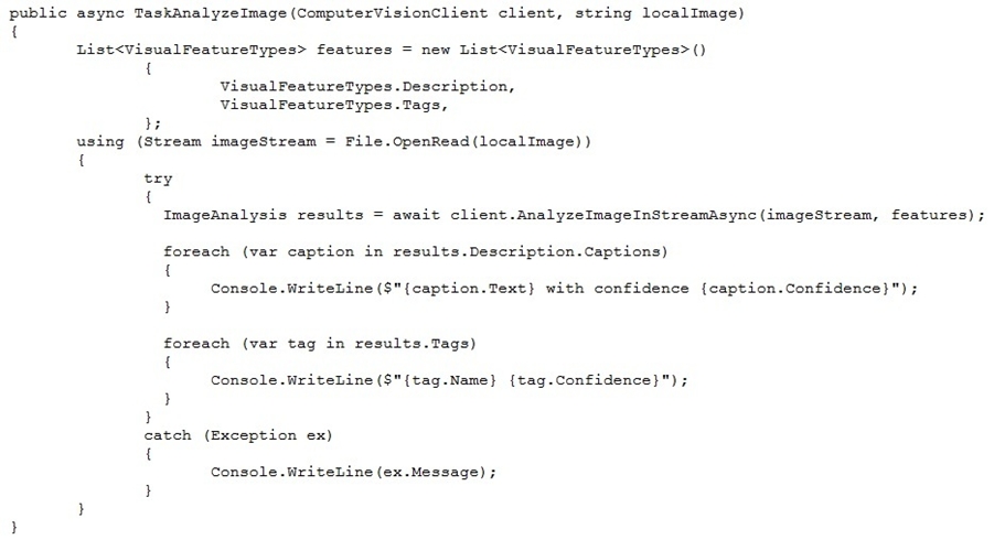 You are developing an application that will use the Computer Vision client library. The application has the following code.