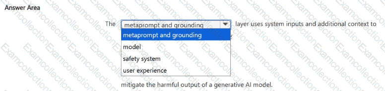 Therefore, the layer that uses system inputs and context to mitigate harmful outputs from a generative AI model is the Safety system layer.
