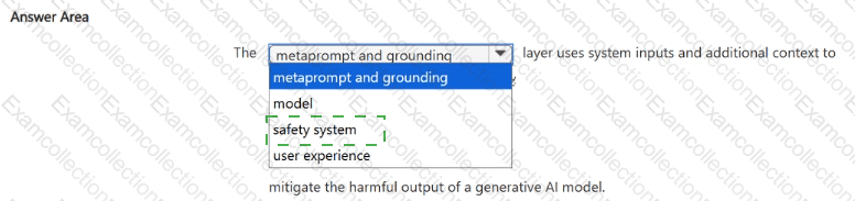 According to the Microsoft Learn documentation and the AI-900: Microsoft Azure AI Fundamentals official study guide, the safety system layer in generative AI architecture plays a crucial role in monitoring, filtering, and mitigating harmful or unsafe model outputs. This layer works alongside the model and user experience layers to ensure that generative AI systems—such as those powered by Azure OpenAI—produce responses that are safe, aligned, and responsible.