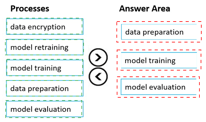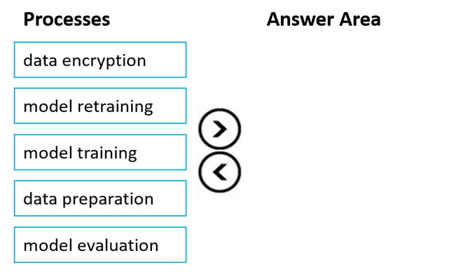 Which three processes should you perform in sequence before you deploy the model? To answer, move the appropriate processes from the list of processes to the answer area and arrange them in the correct order.
