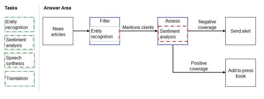 Which natural language processing tasks should you use to complete the process? To answer, drag the appropriate tasks to the correct locations. Each task may be used once, more than once, or not at all. You may need to drag the split bar between panes or scroll to view content.
