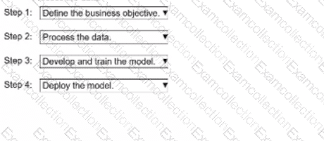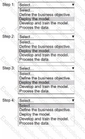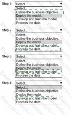 Sated and order the steps from the following bat to correctly describe the ML Lifecycle for a new custom modal Select each step one time. (Select and order FOUR.)