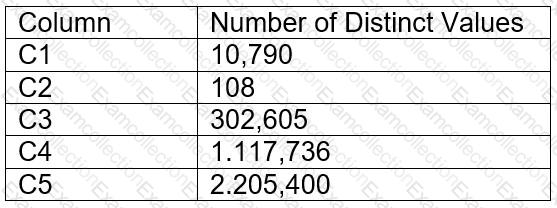 A table contains five columns and it has millions of records. The cardinality distribution of the columns is shown below:
