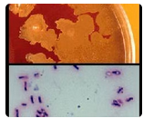 The clue to the identification of the colony seen in the upper frame is the gram stain in the lower frame, in which are seen short, rounded, gram positive bacilli, many of which possess distinct spores. As the colonies grew aerobically, the presence of spores indicates Bacillus species. The colonies are spreading, smooth, yellow-white and non-hemolytic. The lack of hemolysis and the small size of the bacterial cells suggests a species other than Bacillus cereus, the species causing most human infections. The isolate was identified as Bacillus circulans, which is consistent with the gram stain morphology. Clostridium septicum also produces spores; however, this species is an anaerobe and would grow poorly if at all and not produce spores aerobically. Listeria monocytogenes and Lactobacillus species are gram positive bacilli; however, neither of these produce spores.
