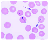 Howell-Jolly bodies are composed of DNA and appear as small round ball-like inclusions inside the red cells. Usually only one Howell-Jolly body will be present in each red cell.