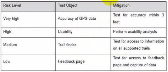 You are managing the test team that is testing a new mobile application that provides a "step-by-step' hiking guide Your risk assessment resulted in the following table: