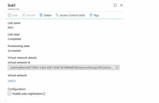 You create a virtual network link for contoso.com as shown in the following exhibit.