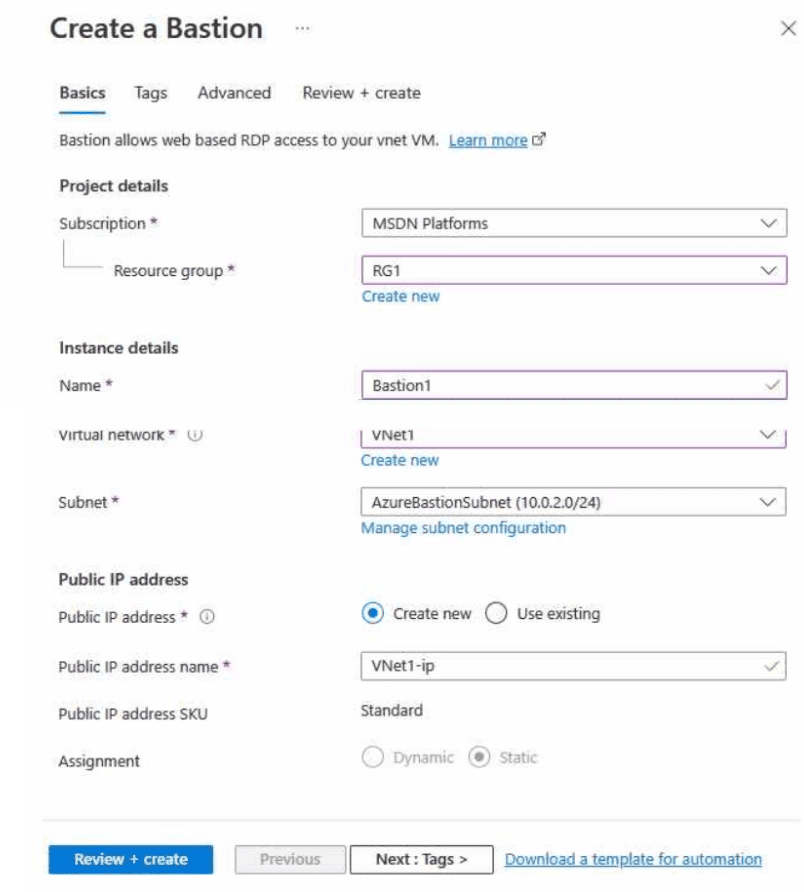 You create an Azure bastion for VNet1 as shown in the following exhibit.