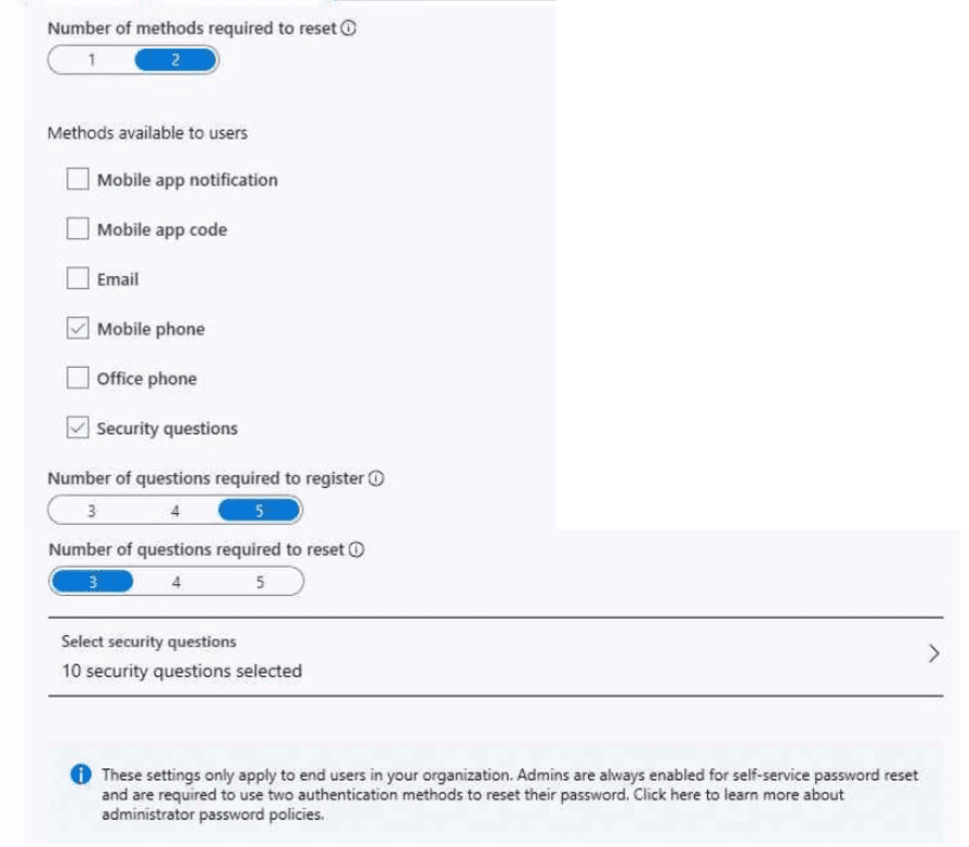You configure the authentication methods for password reset as shown in the Authentication Methods exhibit. (Click the Authentication Methods tab.)