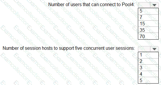 What will be the maximum number of users that can connect to Pool4, and how many session hosts are needed to support five concurrent user sessions? To answer, select the appropriate options in the answer area.