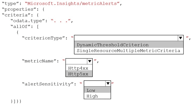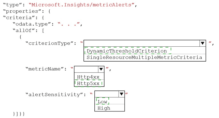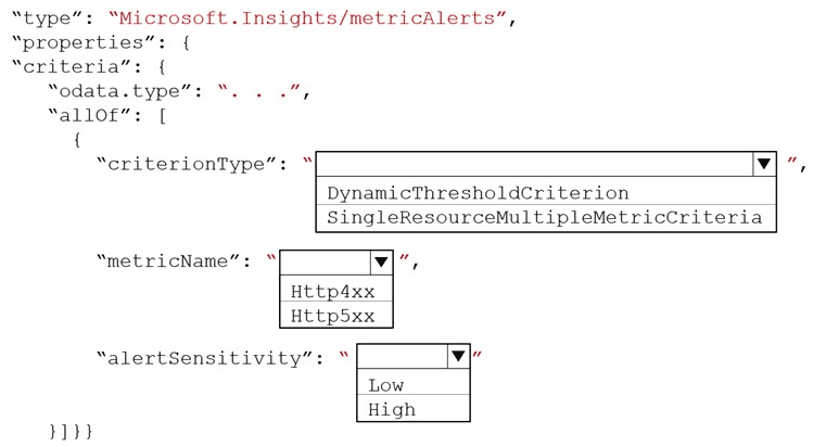 How should you complete the Azure Resource Manager template? To answer, select the appropriate options in the answer area.