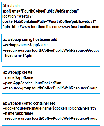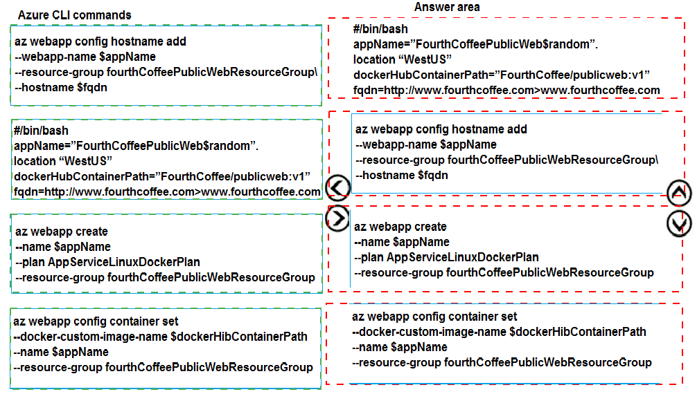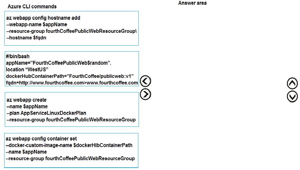 Which order should the CLI commands be used to develop the solution? To answer, move all of the Azure CLI command from the list of commands to the answer area and arrange them in the correct order.