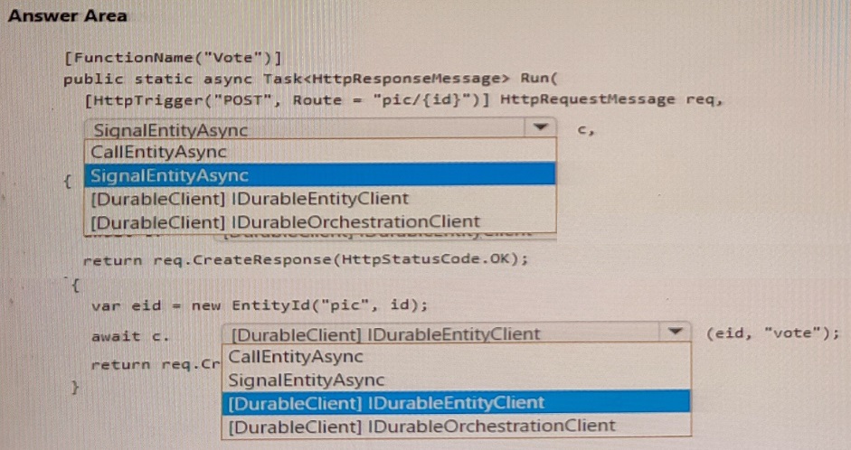 You are developing an online game that allows players to vote for their favorite photo that illustrates a word. The game is built by using Azure Functions and uses durable entities to track the vote count
