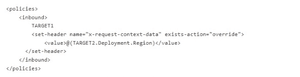You plan to implement a policy that will apply at a product scope and will set the header of inbound requests to include information about the region hosting the gateway of API1. The policy definition contains the following content.