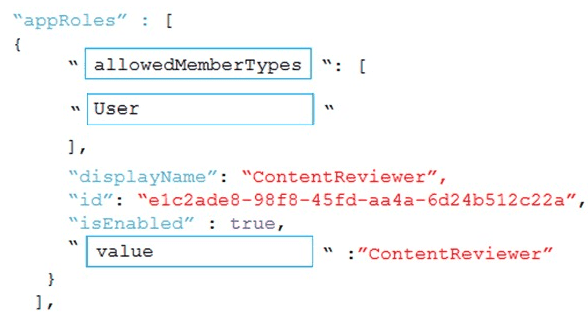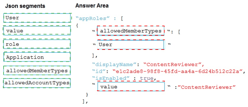 How should you complete the markup? To answer, drag the appropriate json segments to the correct locations. Each json segment may be used once, more than once, or not at all. You may need to drag the split bar between panes or scroll to view content.