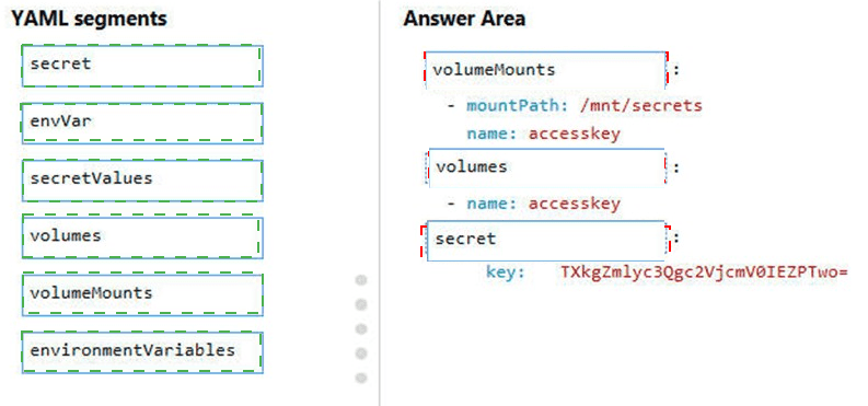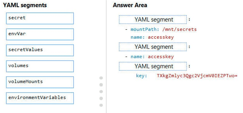 How should you complete the YAML markup? To answer, drag the appropriate YAML segments to the correct locations. Each YAML segment may be used once, more than once, or not at all. You may need to drag the split bar between panes or scroll to view content.