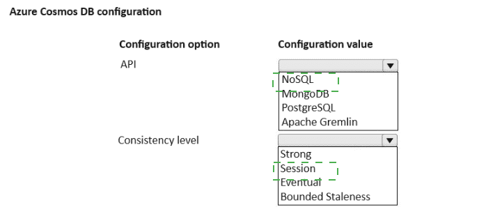 Which Azure Cosmos DB configuration should you use? To answer, select the appropriate options in the answer area.