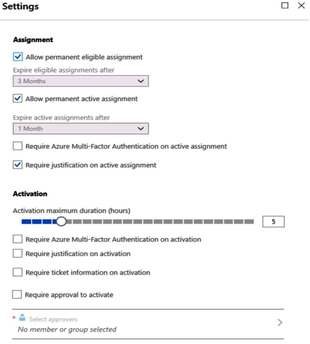From Azure AD Privileged Identity Management (PIM), you configure the settings for the Security Administrator role as shown in the following exhibit.