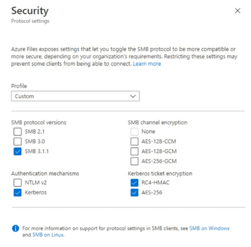 The Security protocol settings for the file shares of storage1 are configured as shown in the following exhibit.