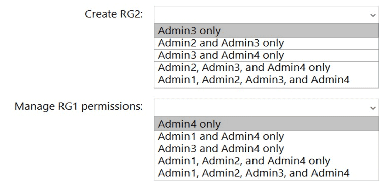 You need to delegate the creation of RG2 and the management of permissions for RG1. Which users can perform each task? To answer select the appropriate options in the answer area. NOTE: Each correct selection is worth one point