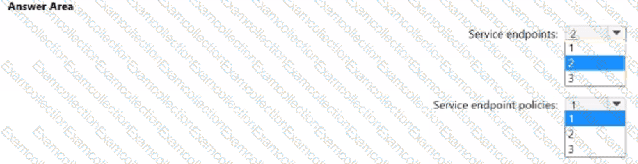 What is the minimum number of service endpoints and service endpoint policies you should create? To answer, select the appropriate options m the answer area.