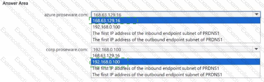 You need to configure the destination IP address for azure.proseware.com and for corp.proseware.com. The solution must meet the general requirements.