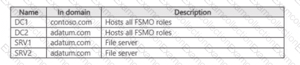 Your network contains two Active Directory Domain Services (AD DS) forests named contoso.com and adatum.com. A two-way external trust exists between contoso.com and adatum.com. The forests contain the servers shown in the following table.