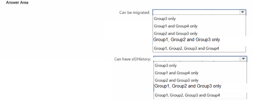 Which groups can be migrated and which groups can have the sIDHistory attribute populated after the migration?