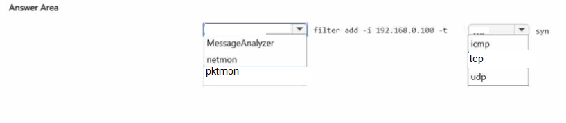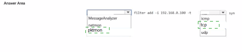 You need to capture the SYN packets exchanged between Server1 and an IP address of 192.168.0.100. How should you complete the command? To answer, select the appropriate options in the answer area.