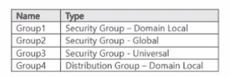Your network contains two Active Directory Domain Services (AD DS) forests named contoso.com and fabtikam.com. Contoso.com includes the groups shown in the following table.