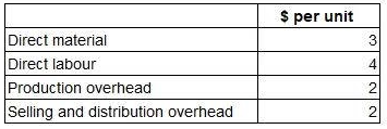 Analysis by the management accountant has shown that 100% of direct material cost and 50% of direct labour cost are variable costs. 50% of production overhead and 100% of selling and distribution overhead are variable costs.
