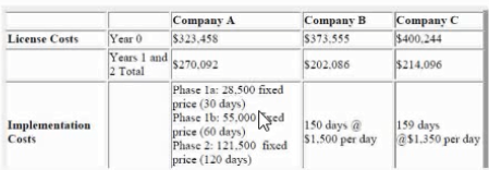 After reviewing the received vendor responses the project team shortlists the candidates to 3 and the BA structures the received information as follows: