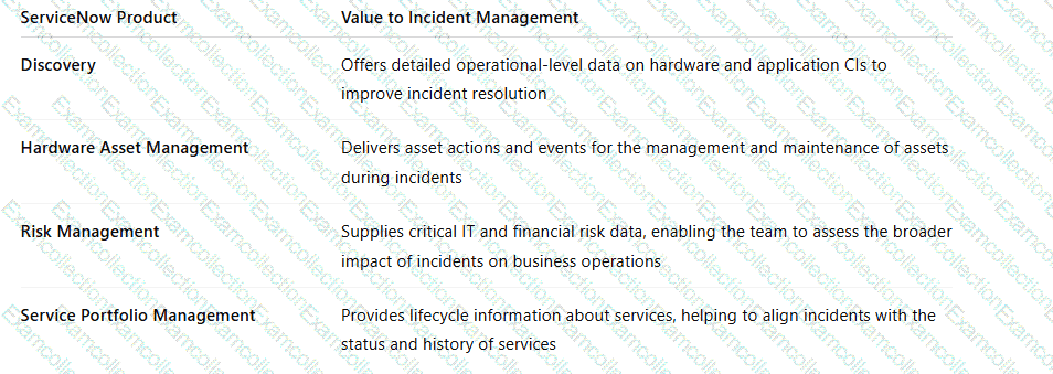 Drag each ServiceNow product to the value it brings in supporting Incident Management.