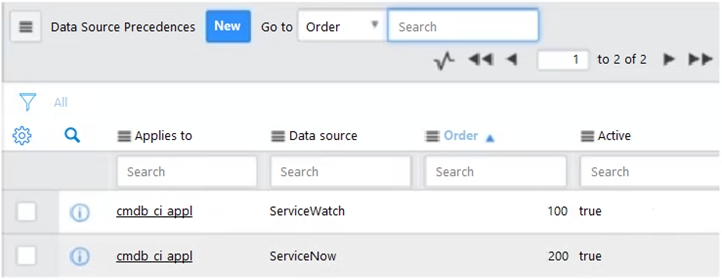 Assuming Reconciliation Rules (Reconciliation Definitions) were configured exactly the same for both Data Sources, ServiceNow and ServiceWatch, for the Application [cmdb_ci_appl] table and the following Data Source Precedence Rules are configured.