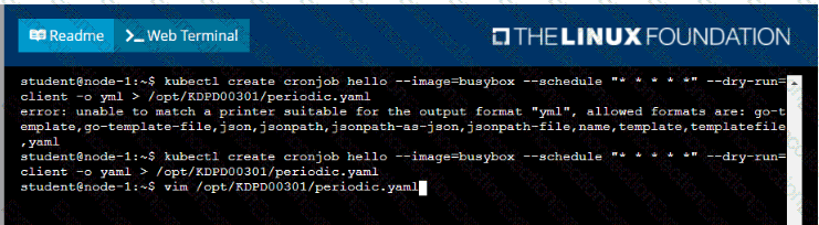 • Create a YAML formatted Kubernetes manifest /opt/KDPD00301/periodic.yaml that runs the following shell command: date in a single busybox container. The command should run every minute and must complete within 22 seconds or be terminated oy Kubernetes. The Cronjob namp and container name should both be hello