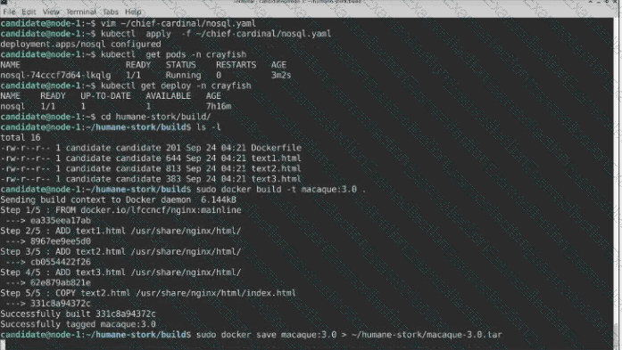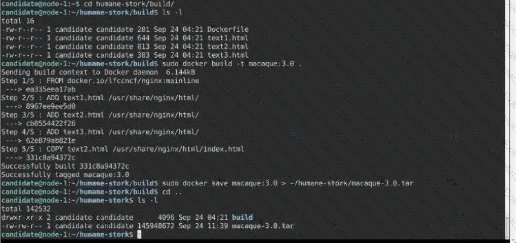 Using the tool of your choice, export the built container image in OCI or Docker image format and store it at /home/candidate/macaque-1.2.tar.