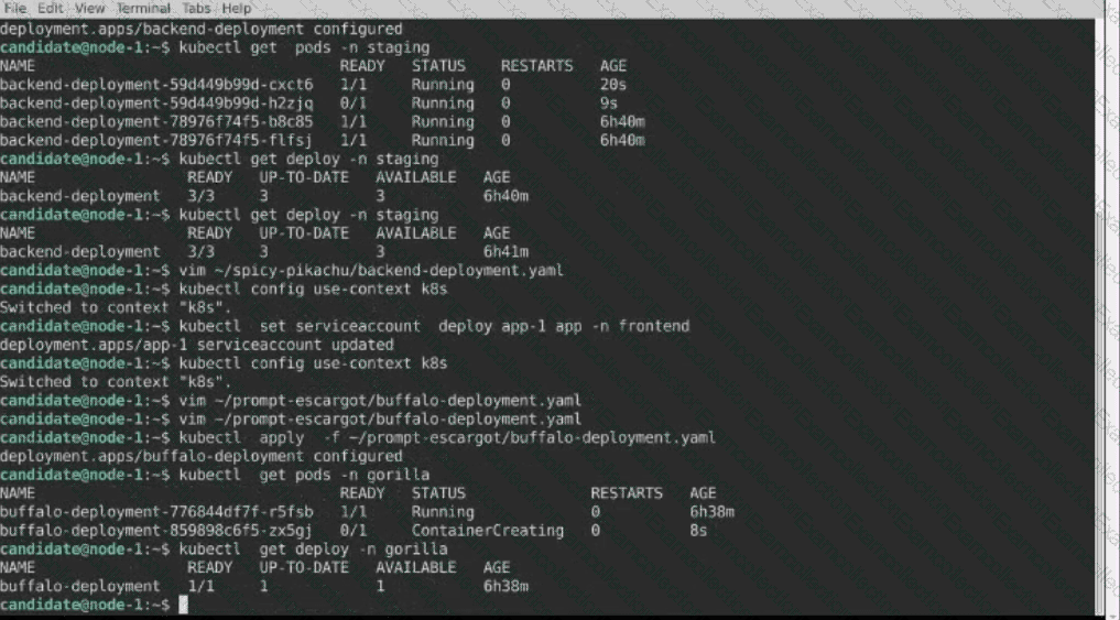 Update the Deployment app-1 in the frontend namespace to use the existing ServiceAccount app.