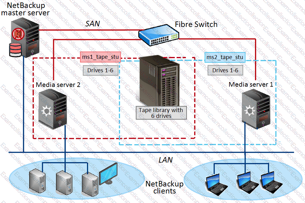 Two media servers, sharing a library with 6 tape drives, exist in the NetBackup environment displayed in the exhibit. Both weekly Full and daily Differential Incremental backups need to run for the clients and each schedule has a different retention period. Because of network topology, some clients back up to Media server 1 and some back up to Media server 2. The environment suffers from multiple status 96 failures during the backup window.