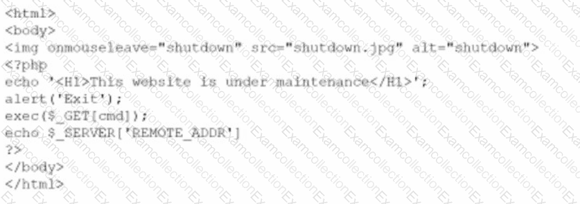 A company brings in a consultant to make improvements to its website. After the consultant leaves. a web developer notices unusual activity on the website and submits a suspicious file containing the following code to the security team: