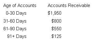 A company has average monthly sales of $2,700, of which 5 percent is on a cash basis, with the remaining sold on open account. The company's accounts receivable aging schedule at the end of March is as follows: