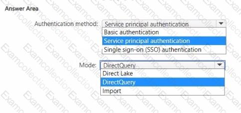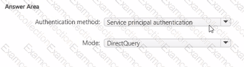Which data source authentication method and mode should you use? To answer, select the appropriate options in the answer area.