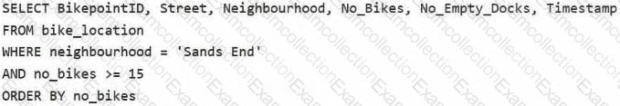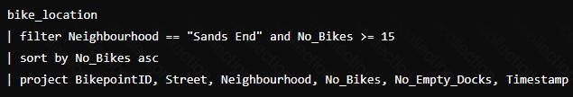 You need to apply transformation and filter logic to prepare the data for consumption. The solution must return data for a neighbourhood named Sands End when No_Bikes is at least 15. The results must be ordered by No_Bikes in ascending order.