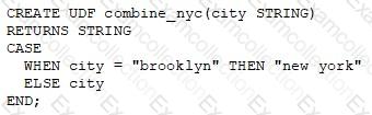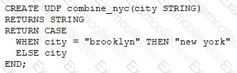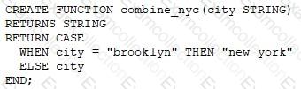A data engineer needs to apply custom logic to string column city in table stores for a specific use case. In order to apply this custom logic at scale, the data engineer wants to create a SQL user-defined function (UDF).