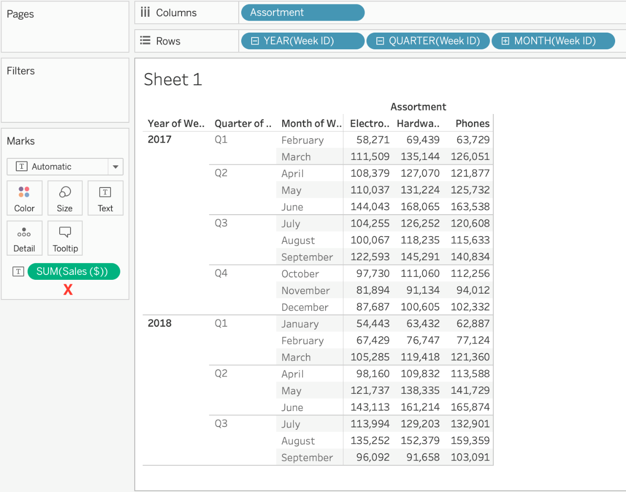 Using the Time Series table, create a cross-tab showing sales for each Assortment broken down by Year and Quarter. In Q4 of October 2017, what was the Average sales amount for the Hardware assortment?