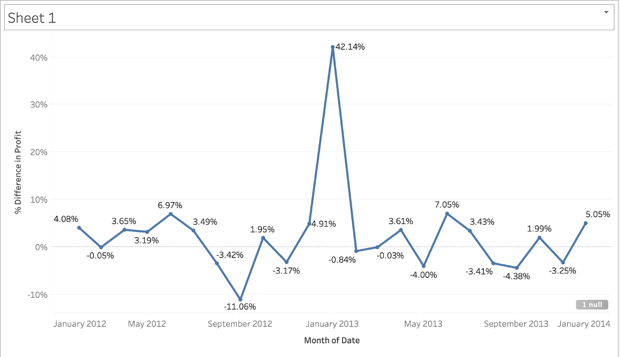 Using the CoffeeChain table, create a chart to see the monthly Percent difference change in Profit, from the beginning of 2012 to the end of 2013. How many months saw a Negative percent difference in Profit?