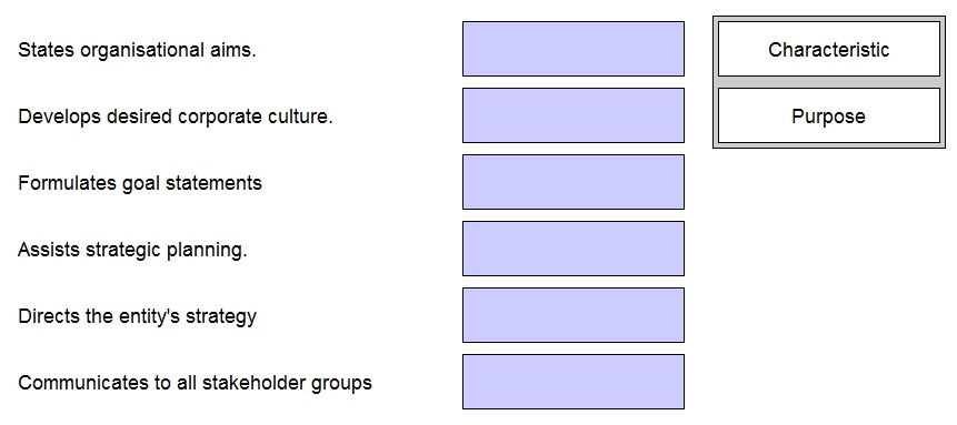 In respect of mission statements, place the word "characteristic" or "purpose" against the relevant activity.