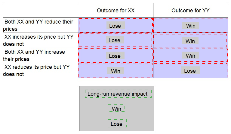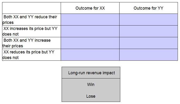 Company XX and Company YY are the only two providers of electricity to Country M. The demand for electricity is price inelastic which means that buyers regard it as essential and therefore demand for electricity does not change significantly if the average price of electricty changes. However customers will switch between suppliers within a year to get cheaper electricity. Using Game Theory place the long-run revenue impact on each firm of each of the following pricing decisions.